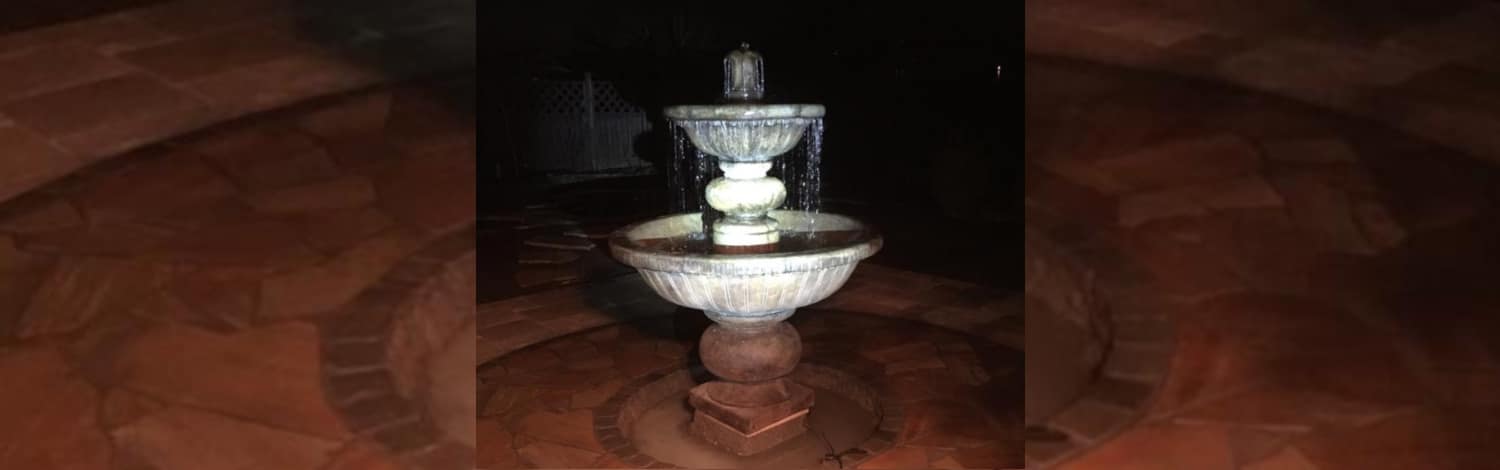 Dieses Kundenfoto erhielten wir zusammen mit einer sehr zufriedenen Kundenbewertung für den Springbrunnen Siena. Erst im Dezember konnte der Gartenbrunnen aufgebaut werden und wurde gleich danach in den Winterschlaf versetzt. Die gelungene Nachtaufnahme hält den Probelauf fest. Wunderschön das beleuchtete Wasserspiel des Brunnens inmitten des mediterran angelegten Terrassenrondells.