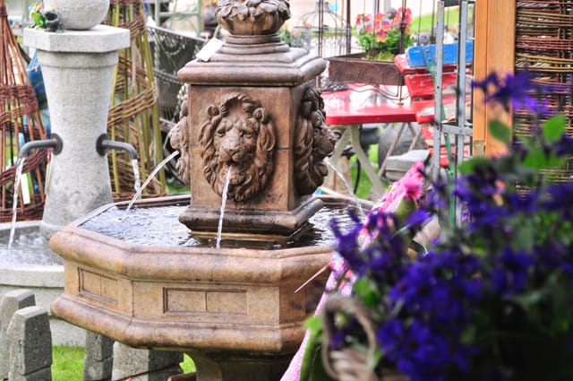 Vom 23. bis 25. Juni 2017 stellen wir in der traumhaften Umgebung des historischen Gutshofs eine Auswahl an Springbrunnen, Steinfiguren und Naturzäunen aus. Das Bild zeigt einen Besuchermagenten in unserer Gartenbrunnen-Ausstellung: Den »Löwenbrunnen von Henri Studio.