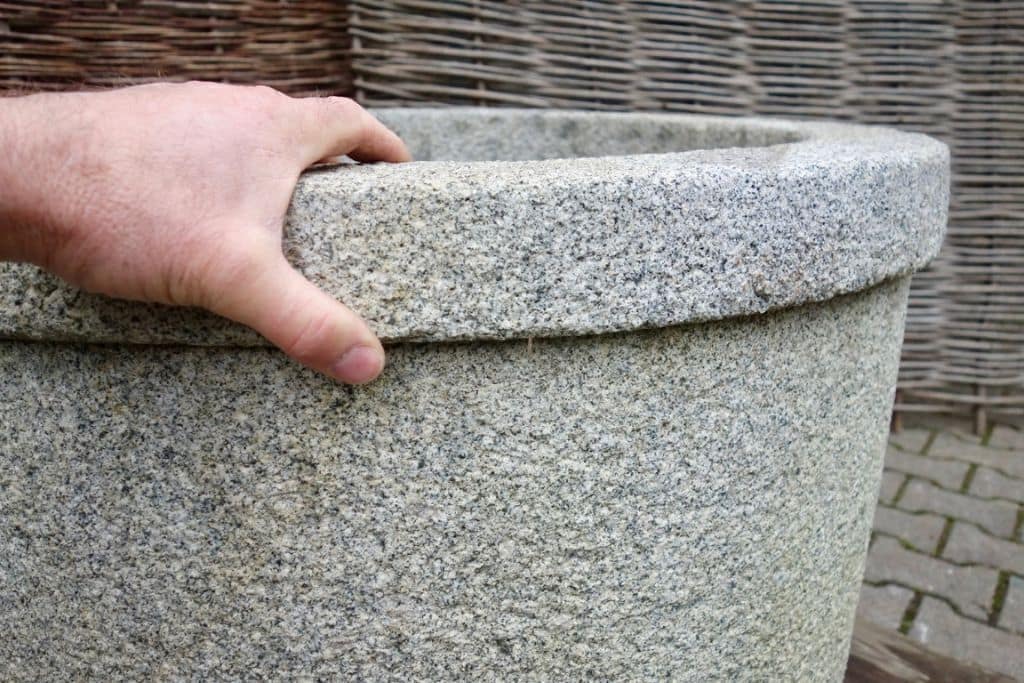 Zwei große Pflanztröge in Granit: Naturstein, Steinmetzarbeit, Oberfläche gespitzt. Nur als Paar verkäuflich.