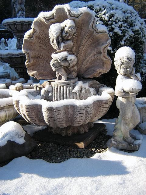 Der barock anmutende Gartenbrunnen in Muschelform plätschert bezaubernd und klar. Er besteht aus frostfestem Steinguss und wird in Deutschland hergestellt.