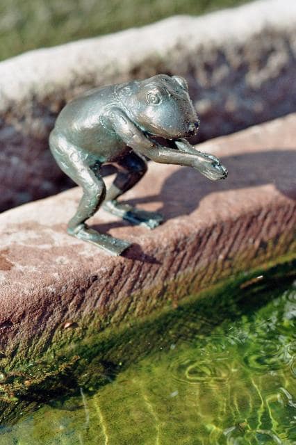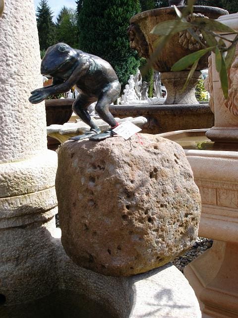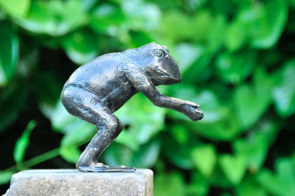 Kleine Bronzefigur eines Frosches, der zum Kopfsprung ansetzt, in hervorragender Verarbeitung. Ideal zur Verschönerung eines Becken-, Teich- oder Brunnenrandes. Oder einfach nur so. Im Lieferumfang enthalten sind kleine Gewindestifte, die unsichtbar von unten in die Beinchen geschraubt werden.