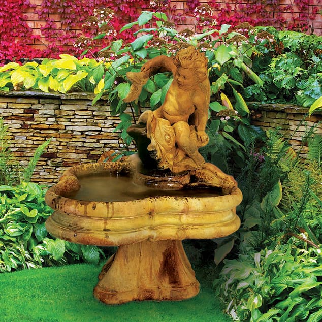 Henri-Studio-Brunnen mit Puttenfigur und Delphin: Bassin und Sockel des Delphinbrunnens sind im barocken Stil geformt.