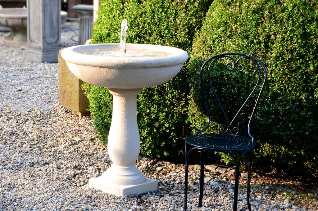 Stilvoll, schlicht und wunderschön: Der runde Gartenbrunnen „Bellerive“ aus Sandstein beeindruckt mit der klassischen Schönheit romanischer Stilelemente. Die Brunnenschale mit gewölbtem Rand ruht auf einer leicht bauchigen Säule mit Wulst und Hohlkehle über der quadratischen Sockelplatte. Die feine Fontäne sprudelt lebendig über dem schillernden Wasserspiegel.