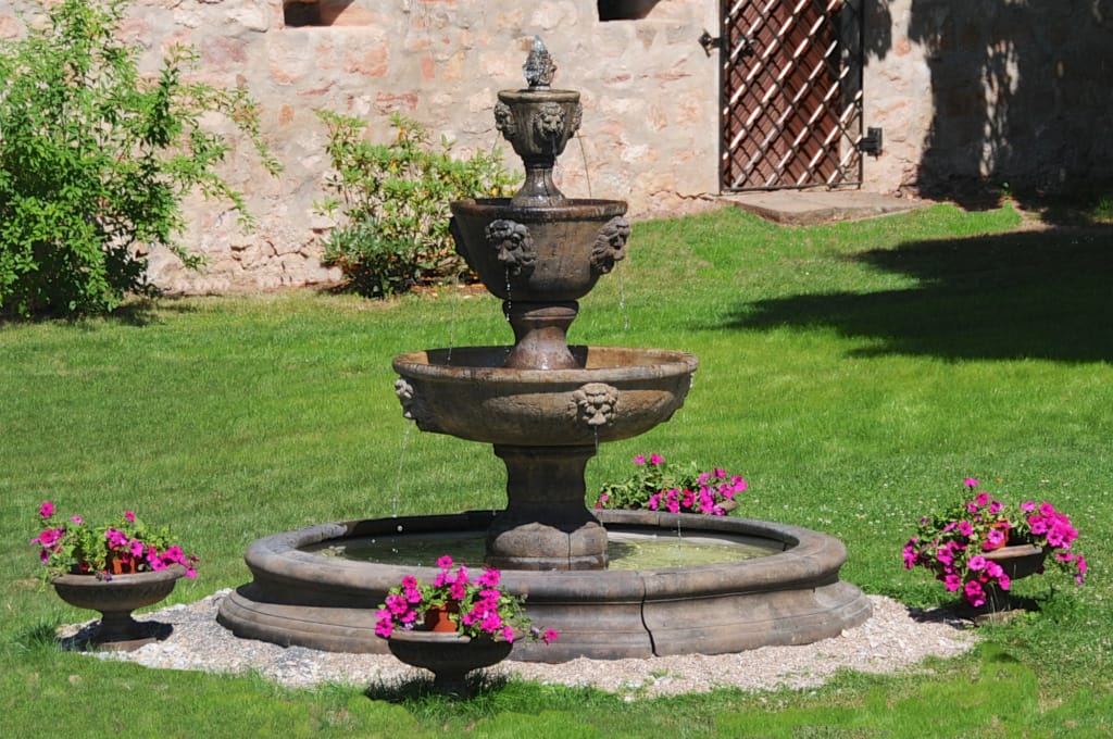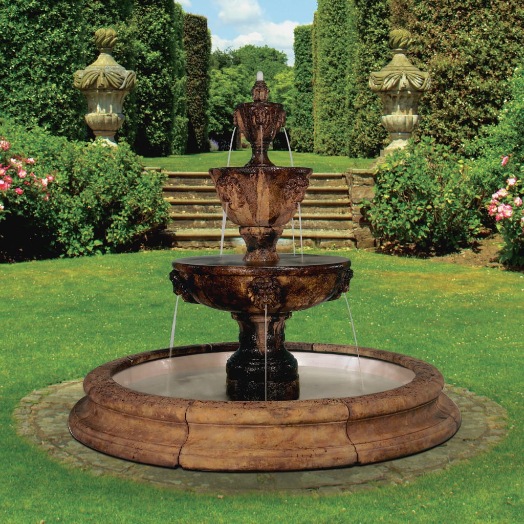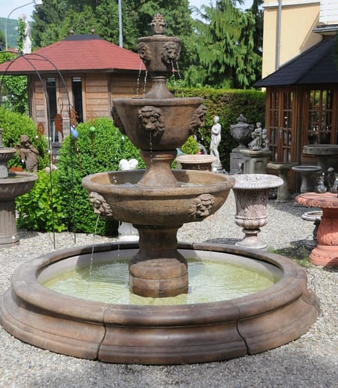 Den Gartenbrunnen „Cinque Terre“ mit Löwenköpfen gibt es in drei Ausführungen: Zweistufig, dreistufig und dieser vierstufige Springbrunnen mit Bodenschale.