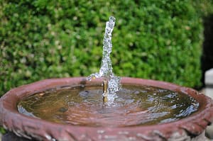 Ein kleiner Gartenbrunnen in Sandsteinoptik mit fröhlicher Fontäne. Die Umwälzpumpe liegt versteckt unter der Messingdüse, aus der das Wasser ins schön verzierte Brunnenbecken plätschert.