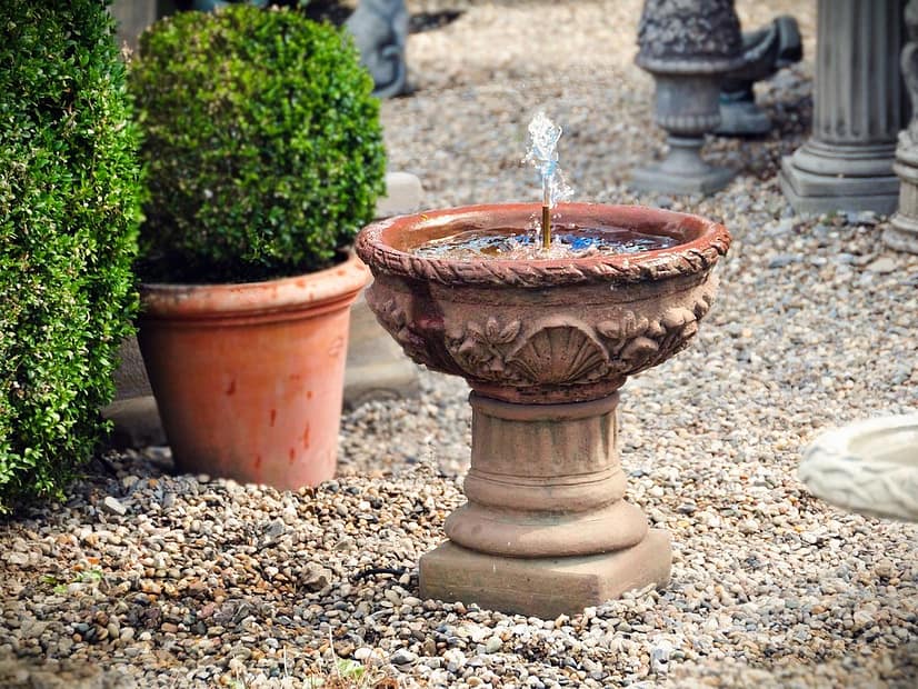 Ein kleiner Gartenbrunnen in Sandsteinoptik mit fröhlicher Fontäne. Die Umwälzpumpe liegt versteckt unter der Messingdüse, aus der das Wasser ins schön verzierte Brunnenbecken plätschert.