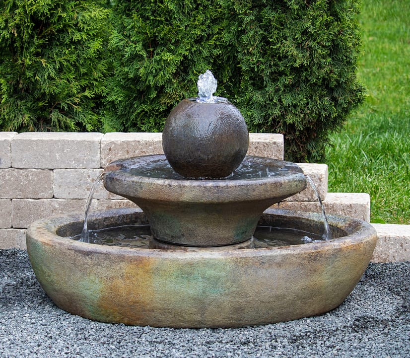 Ein zeitloser Gartenbrunnen von Henri Studio mit einer wasserumspielten Kugel und ovaler Bodenschale.