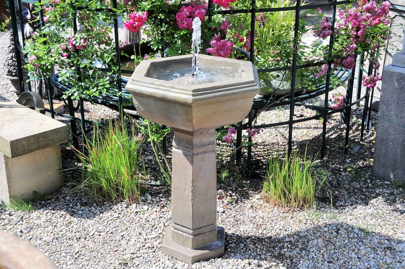 Gartenbrunnen aus gelbem Sandstein mit sechseckiger Brunnenschale auf Sechskantsockel. Das Brunnenwasser zirkuliert angetrieben von einer versteckt montierten Umwälzpumpe und sprudelt spielerisch mit feiner Fontäne.