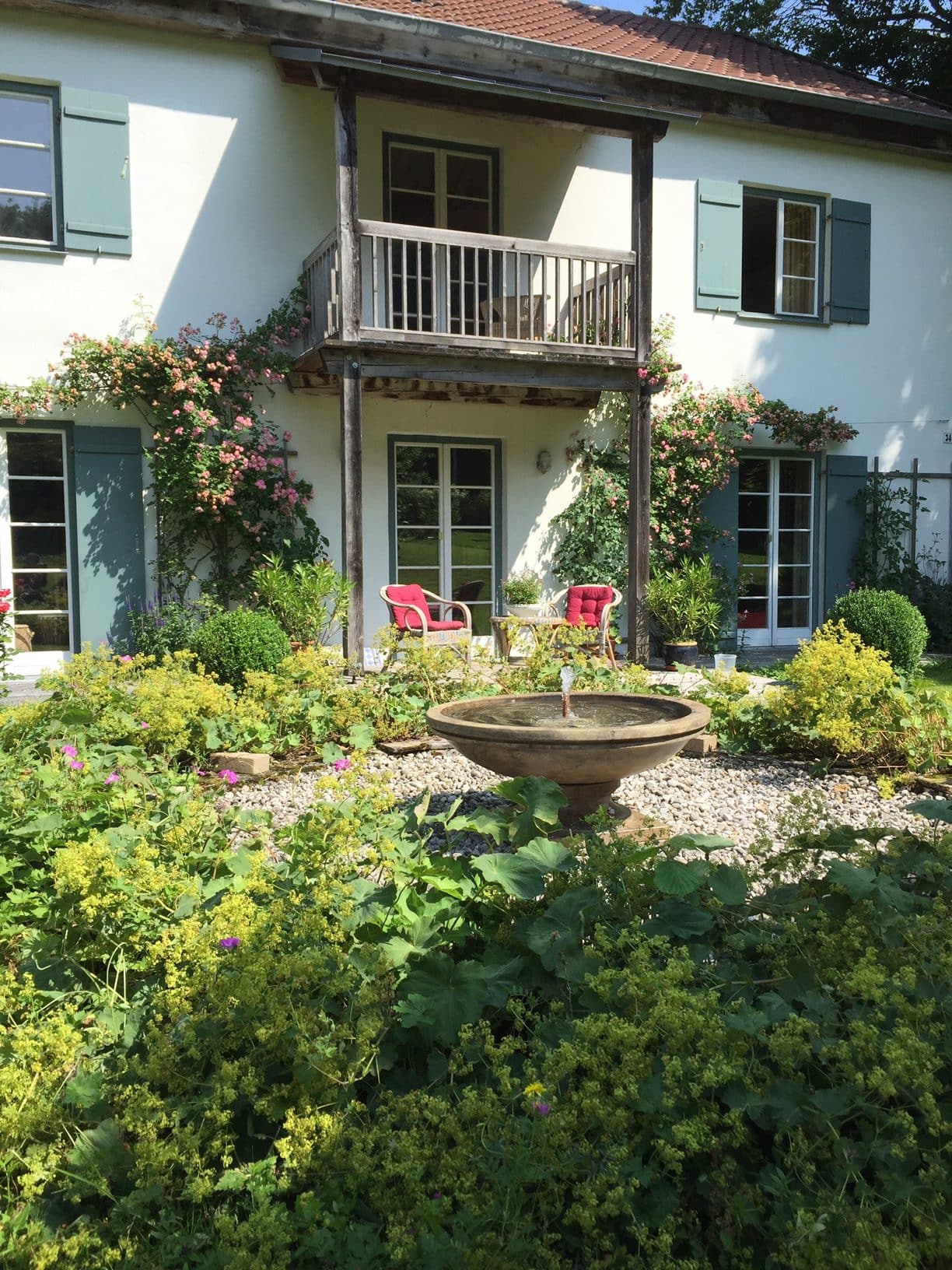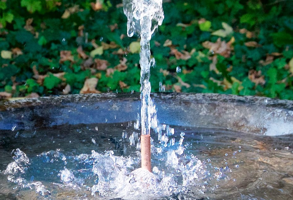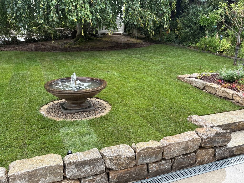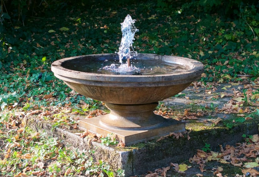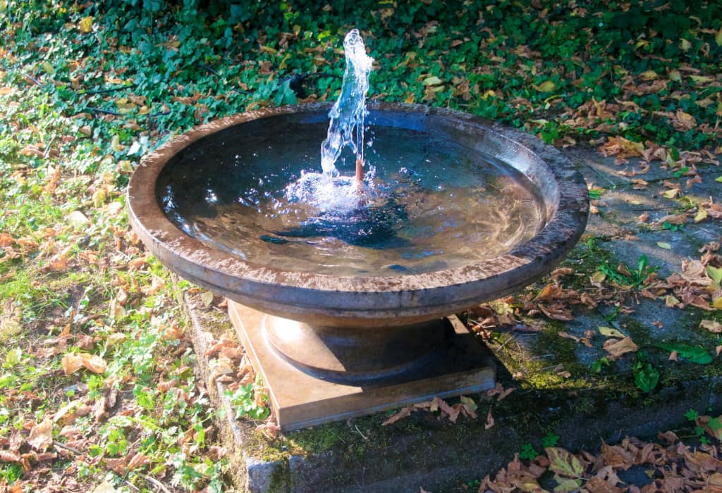 Gartenbrunnen mit schön geformter großer Schale auf schlichtem Sockel und sprudelnder Fontäne. Der Wasserstrahl steigt durch ein Kupferrohr auf und fällt lebendig plätschernd zurück auf den weiten Wasserspiegel.