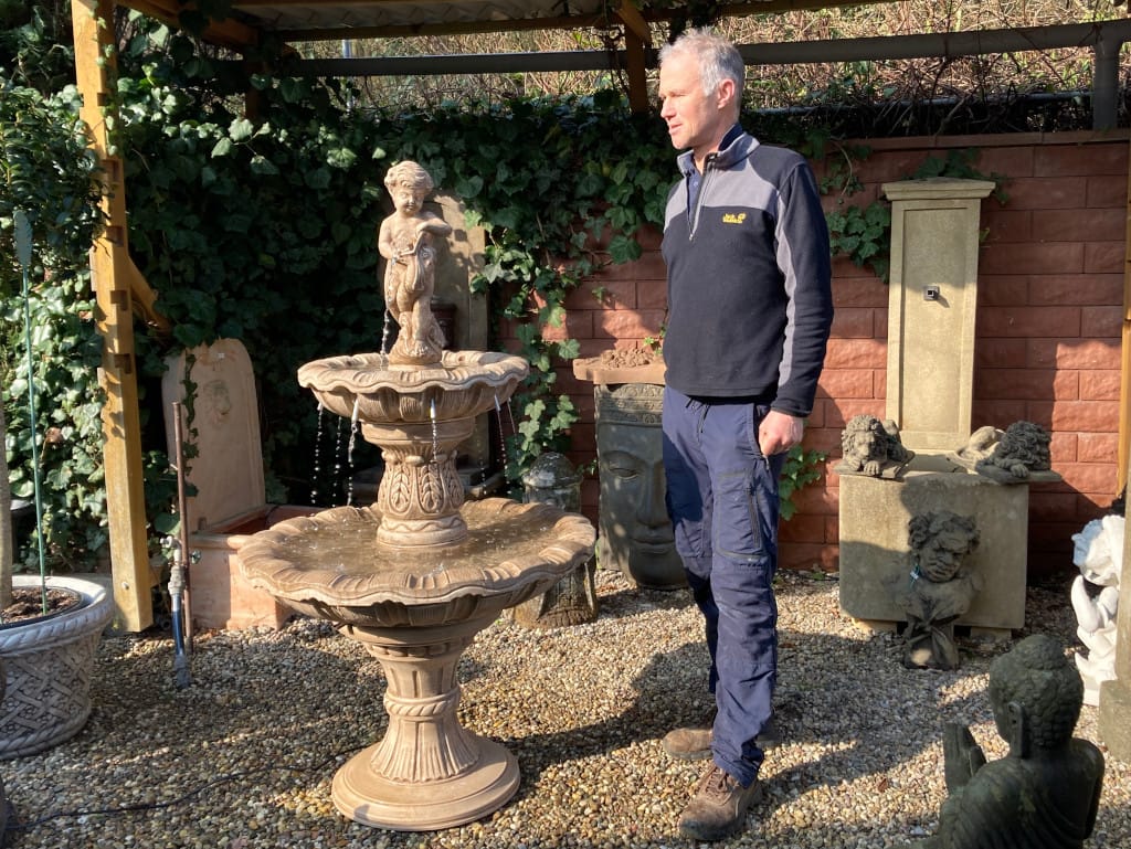 Diesen Zierbrunnen mit Putte und wasserspeiendem Delfin haben wir seit 35 Jahren im Programm: Einer unserer absoluten Klassiker, hergestellt in Deutschland und technisch perfektioniert.