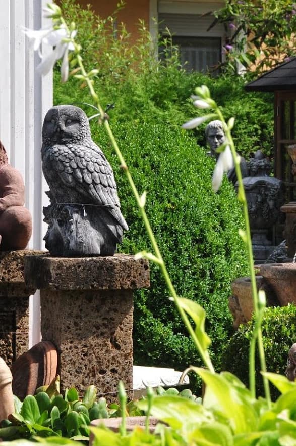 Wir führen verschiedene Eulen aus Steinguss, Beispiel siehe Foto mit Steineule in unserer Verkaufsausstellung 2018.