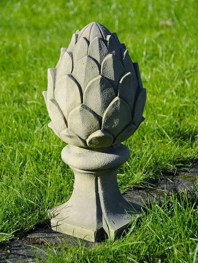 Pinienzapfen aus Steinguss sind klassische Stilelemente im mediterranen Garten. Der Zapfen der Zirbelkiefer heißt auch Zirbelnuss und ist ein Symbol der Auferstehung, denn die Pinie gilt als Lebensbaum.