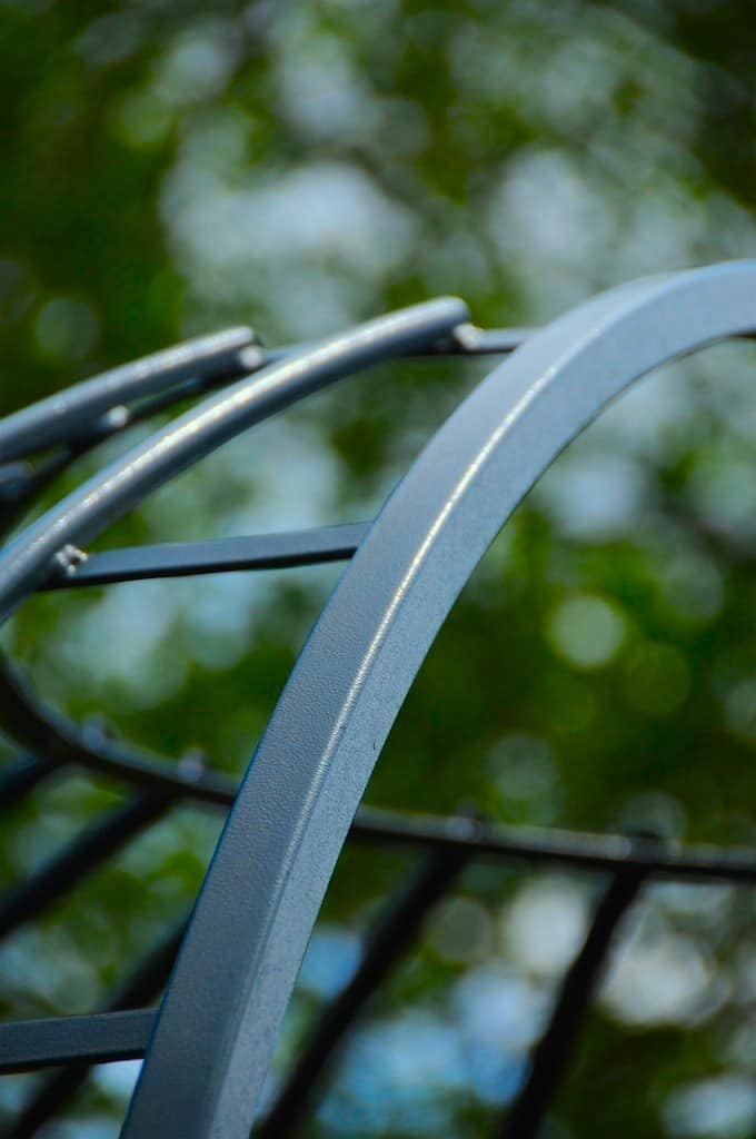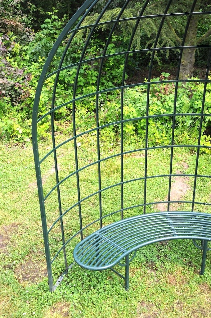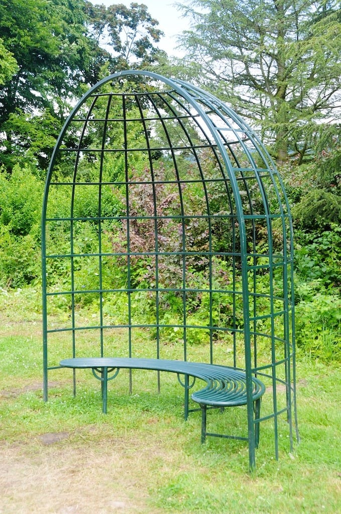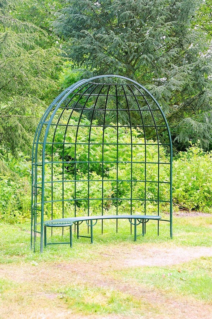 Zeitlose Ranklaube mit Sitzbank aus feuerverzinktem Stahl, dunkelgrün lackiert. Der große Rankbogen ist speziell für Rosen gedacht, eignet sich aber natürlich für andere Rankpflanzen.