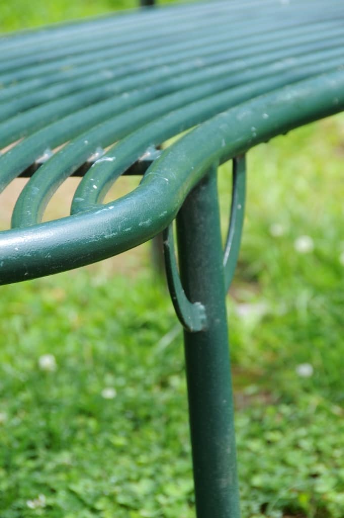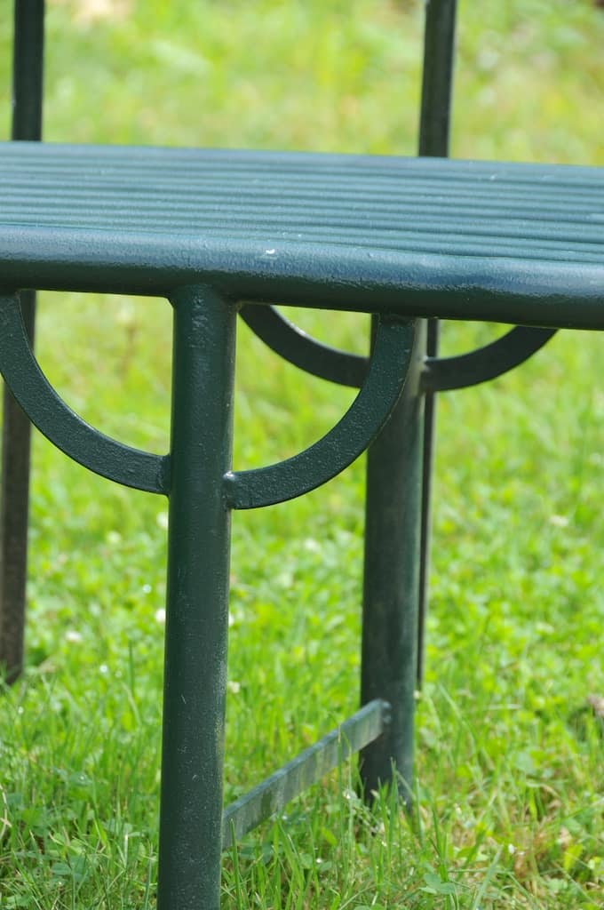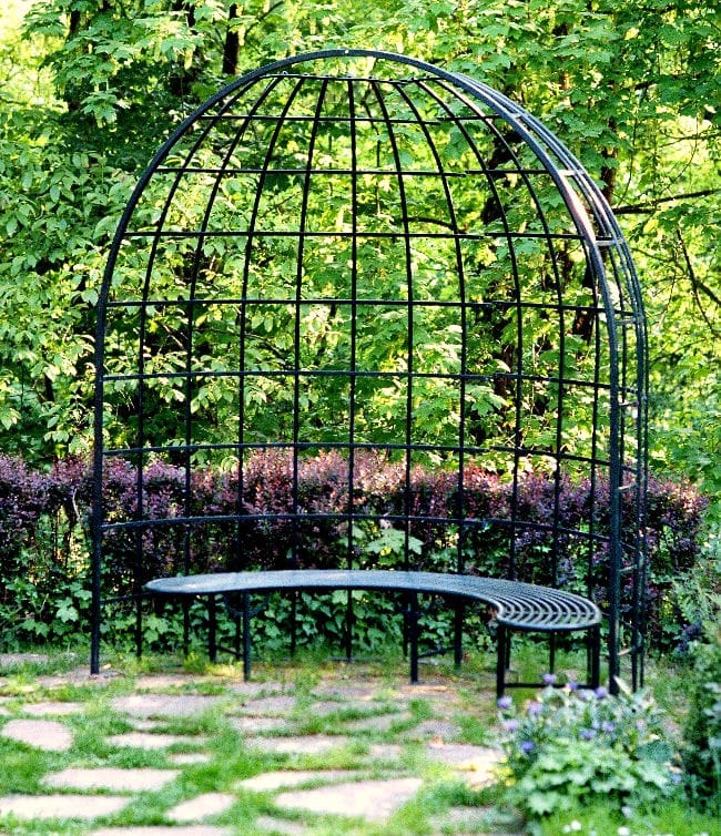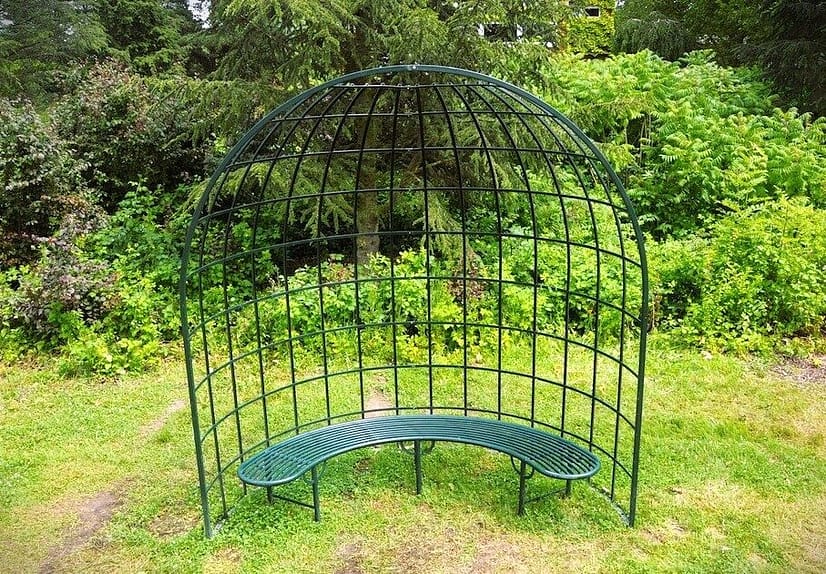 Zeitlose Ranklaube mit Sitzbank aus feuerverzinktem Stahl, dunkelgrün lackiert. Der große Rankbogen ist speziell für Rosen gedacht, eignet sich aber natürlich für andere Rankpflanzen.