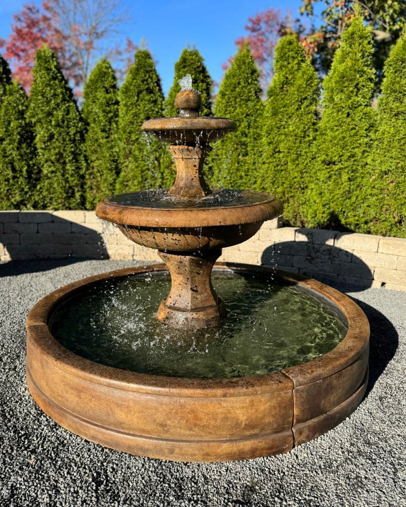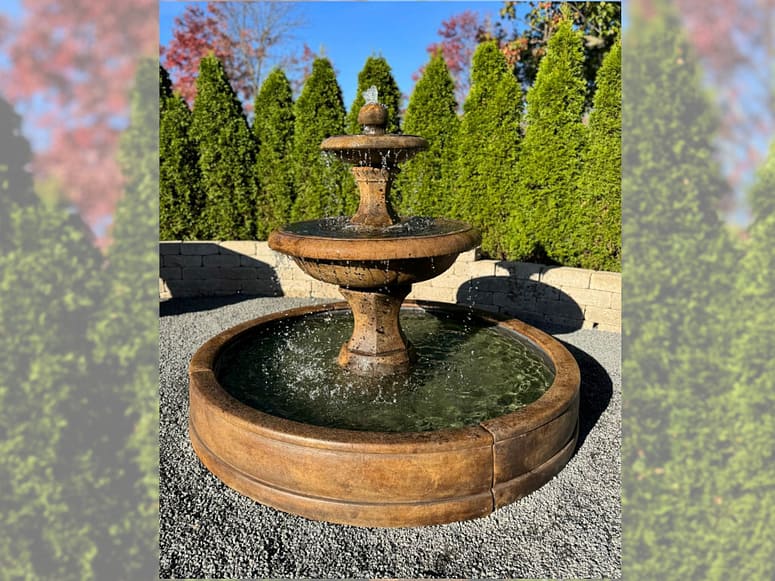 Dreistufiger Gartenbrunnen mit Bodenschale von Henri Studio – etwas größer, aber leichter als Barrington Fountain I.