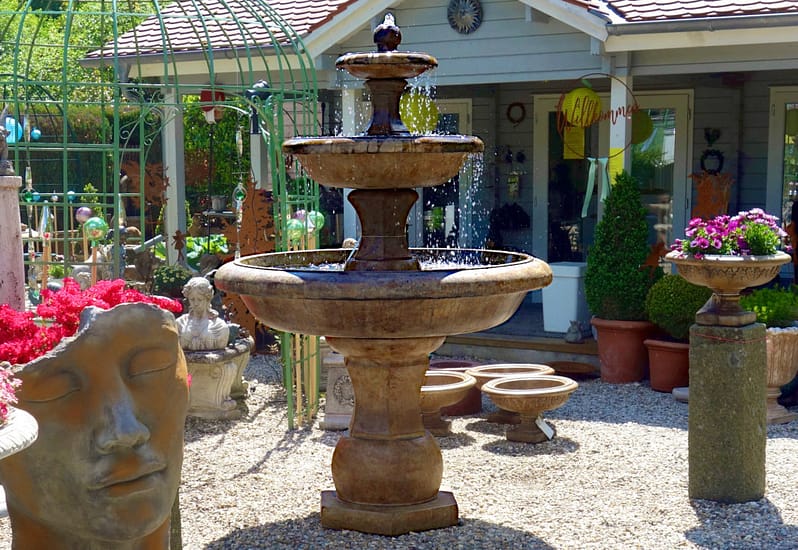 Dieser Gartenbrunnen besteht aus einem hochwertigen, frostbeständigen Steinguss. Die Herstellung erfordert ein hohes Maß an Handwerkskunst und Know-How. Mehr im Blog »Kleine Materialkunde zu Steingussbrunnen.