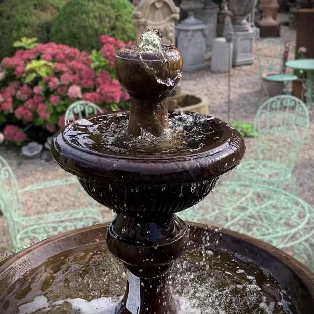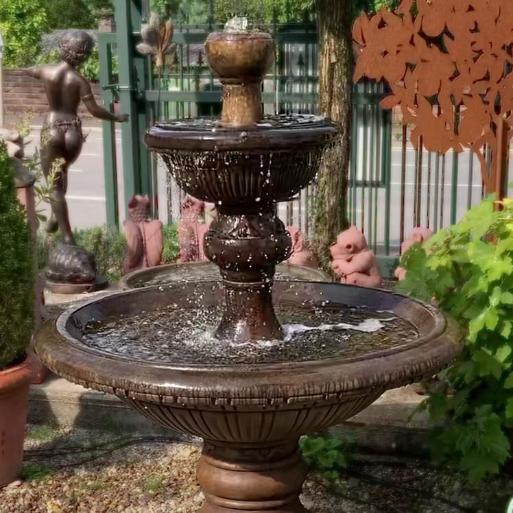 Der mediterrane Gartenbrunnen „Traviata“ scheint auf den ersten Blick eine zierlichere Version des „Siena Fountain“ – beide zweistufig, etwa gleich in Höhe und Durchmesser, aber 140 Kg leichter: Die Form ist weniger üppig, die Mittelsäule dünner, die große Brunnenschale flacher. Dieser Henri-Studio-Brunnen interpretiert den italienischen Stil leicht und elegant mit schlicht gestalteter Fontäne, zurückhaltendem Dekor und feinen Kanneluren.