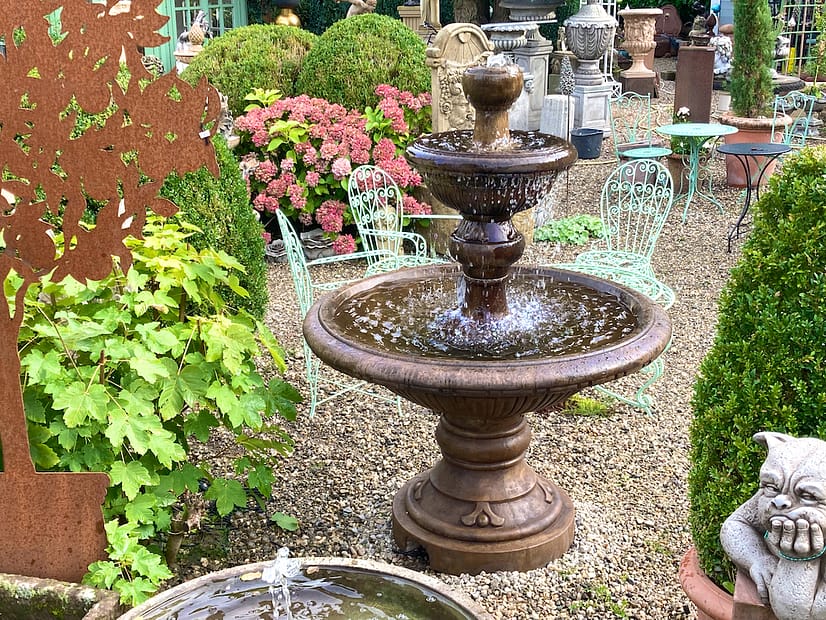 Dieser Gartenbrunnen besteht aus einem hochwertigen, frostbeständigen Steinguss. Die Herstellung erfordert ein hohes Maß an Handwerkskunst und Know-How. Mehr im Blog »Kleine Materialkunde zu Steingussbrunnen.