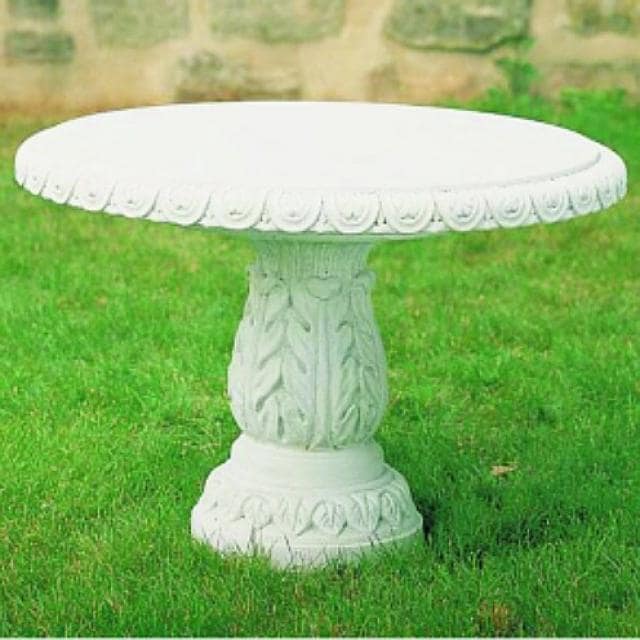 Klassischer runder Gartentisch aus Steinguss, hergestellt in Deutschland. Der Steintisch passt zur gebogenen Steinbank Artikel 0202. Hervorragende Verarbeitung. Unverwüstlich und elegant.