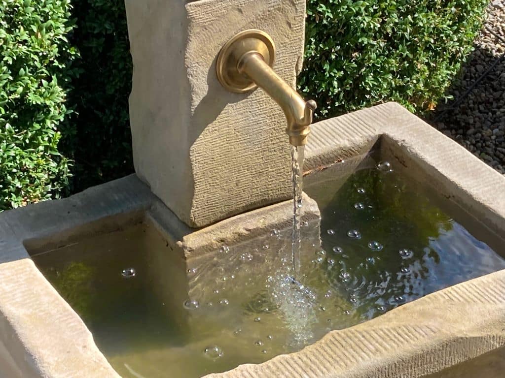 Der Trogbrunnen aus Naturstein kann mit Umwälzpumpe oder mit Druckwasseranschluss direkt an einer Hauswasserleitung betrieben werden.
