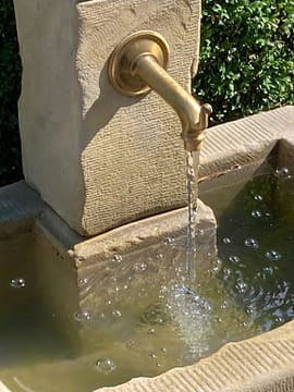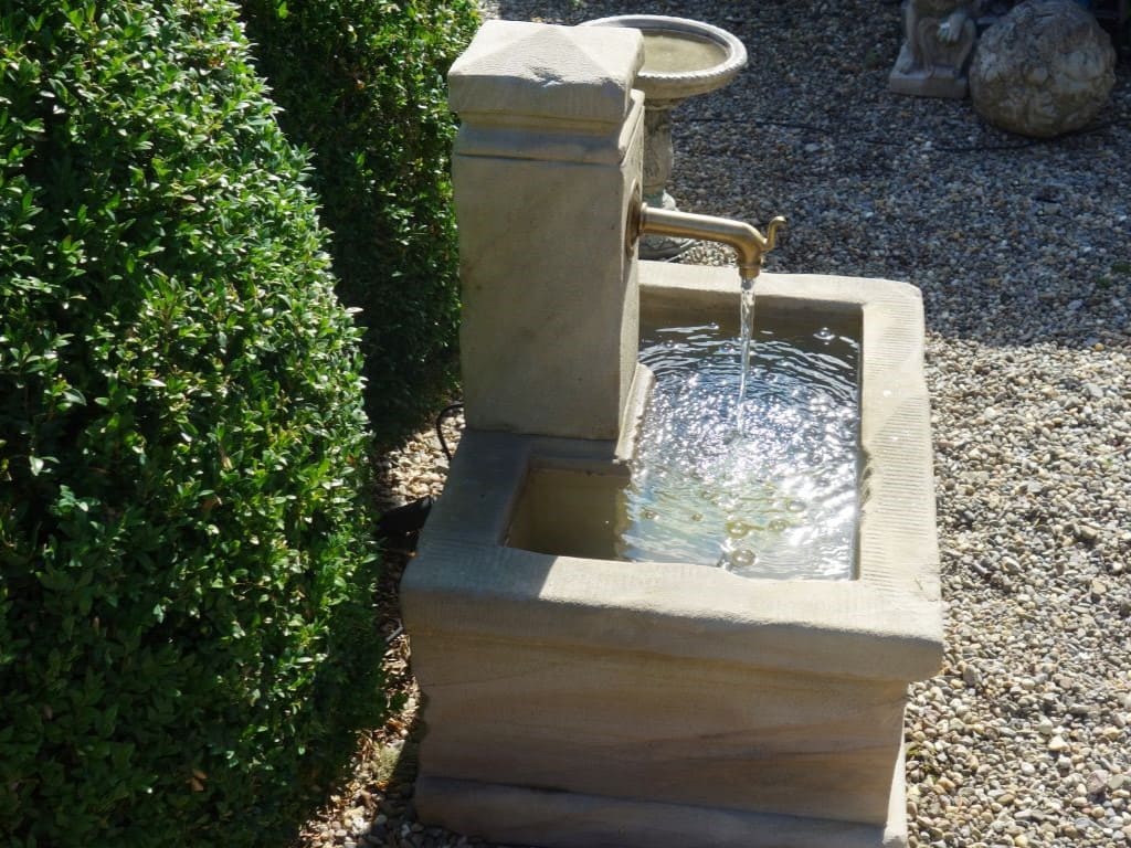 Der Trogbrunnen aus Naturstein kann mit Umwälzpumpe oder mit Druckwasseranschluss direkt an einer Hauswasserleitung betrieben werden.