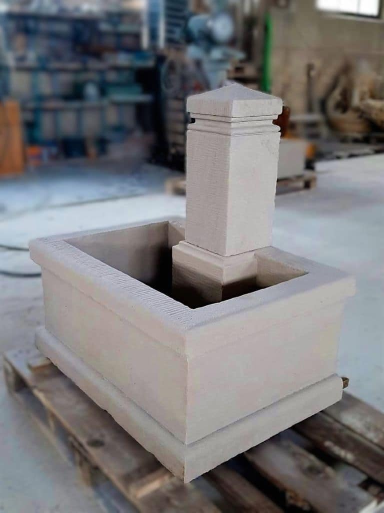 Traditionelle Steinmetzarbeit von Meisterhand: Jeder dieser Sandsteinbrunnen ist ein in Handarbeit gefertigtes Einzelstück, mit viel Erfahrung und Sorgfalt individuell aus Natursteinblöcken gehauen.