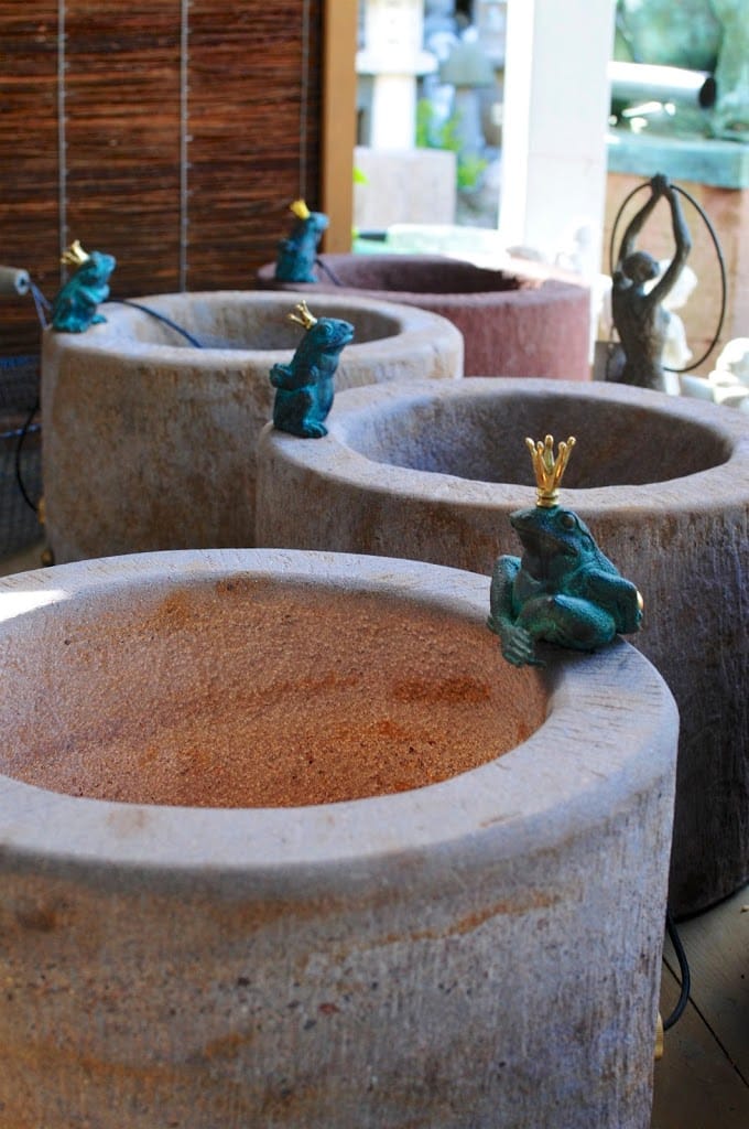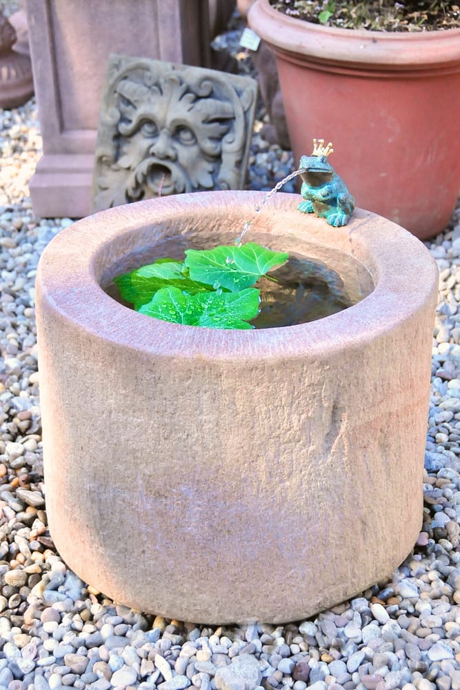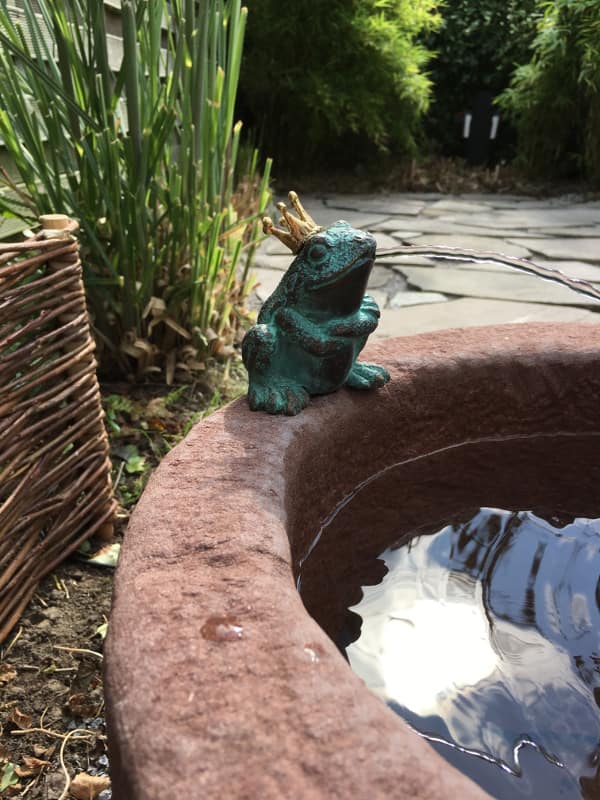 Dieser originelle Natursteinbrunnen aus Sandstein hat einen Froschkönig aus Bronze als Wasserspeier. Das Geplätscher ist nicht zu überhören. Die Umwälzpumpe liegt im Becken und wird mit schönen Steinen kaschiert.