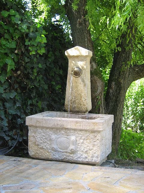 Dieser Trogbrunnen ist eine Bildhauerarbeit aus Sandstein. Wirkungsvoll steht er vor einer Mauer oder Hecke. Frisch rauscht das Wasser in den Trog: Gleich denkt man an einen Dorfbrunnen auf dem Marktplatz. Die Umwälzpumpe befindet sich unter dem Aufsatz.