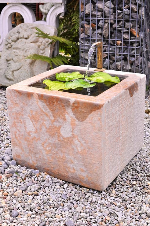 Dieser quadratische Trogbrunnen ist auf Anfrage auch in rotem Sandstein erhältlich.