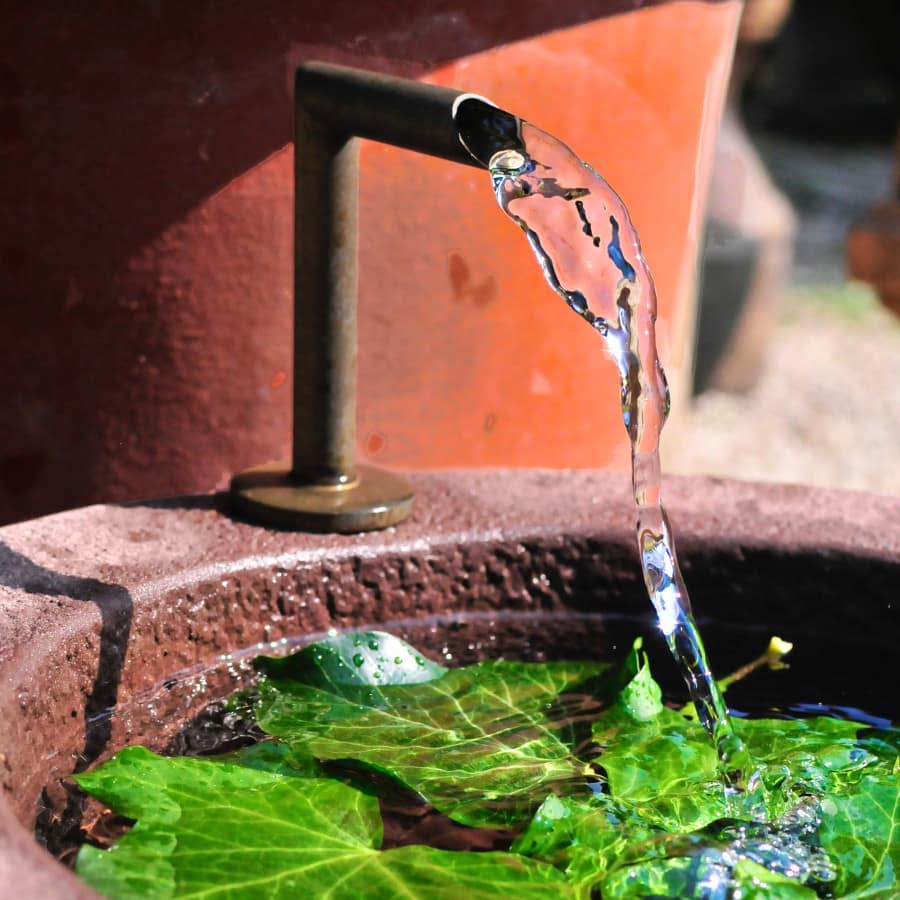 Dieser schlichte Natursteinbrunnen aus rotem Sandstein mit dem eleganten Messingspeier ist eine Bildhauerarbeit. Die Umwälzpumpe liegt im Becken und wird mit schönen Steinen kaschiert. Im Winter muss das Brunnenwasser entleert werden. Dieser runde Trogbrunnen ist auf Anfrage auch in gelben Sandstein erhältlich.