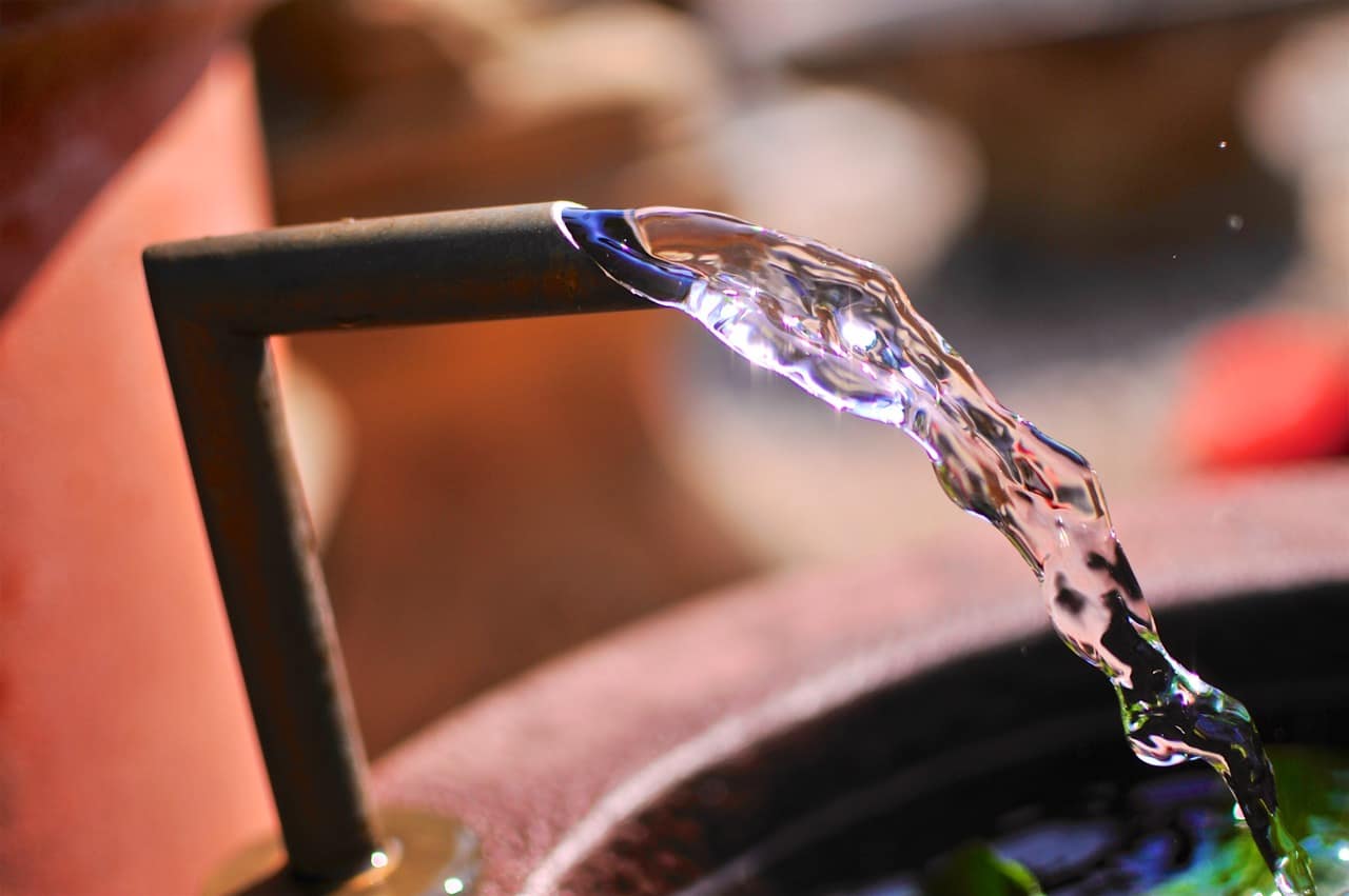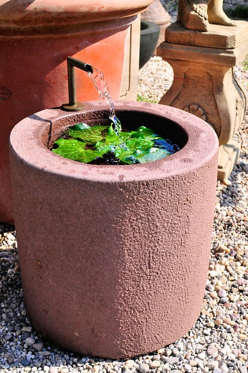 Dieser schlichte Natursteinbrunnen aus rotem Sandstein mit dem eleganten Messingspeier ist eine Bildhauerarbeit. Die Umwälzpumpe liegt im Becken und wird mit schönen Steinen kaschiert. Im Winter muss das Brunnenwasser entleert werden. Dieser runde Trogbrunnen ist auf Anfrage auch in gelben Sandstein erhältlich.