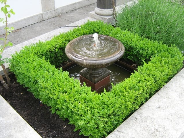 Das Wasserbecken im Artikelbild besteht aus Eisen und ist in den Boden eingelassen. Die Fotos zeigen ein Anwendungsbeispiel für die zum Brunnen umgebaute Wasser sprudelnde Steinvase.