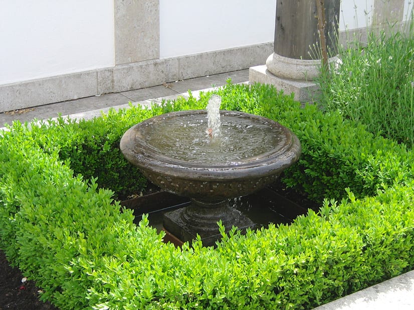 Das Wasserbecken im Artikelbild besteht aus Eisen und ist in den Boden eingelassen. Die Fotos zeigen ein Anwendungsbeispiel für die zum Brunnen umgebaute Wasser sprudelnde Steinvase.