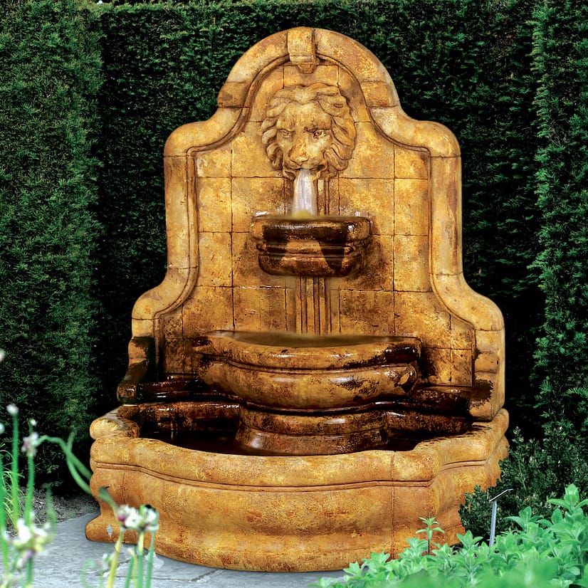 Beeindruckender Löwenkopfbrunnen mit großem Wandpanel in antikem Erscheinungsbild. Aus dem Löwenmaul fließt das Wasser in zweistufiger Kaskade in das große Brunnenbecken. Der Henri-Studio-Brunnen ist mit Liebe zum Detail geformt und oberflächenveredelt: Das Löwenkopfrelief ist kunstvoll gestaltet, das von Hand aufgetragene Antikfinish arbeitet Feinheiten heraus. Die Patina schreitet mit der Zeit natürlich fort und verleiht dem Wandbrunnen aus Steinguss noch effektvollere Schattierungen. Auf Wunsch gibt es den Löwenbrunnen mit Unterwasserbeleuchtung.