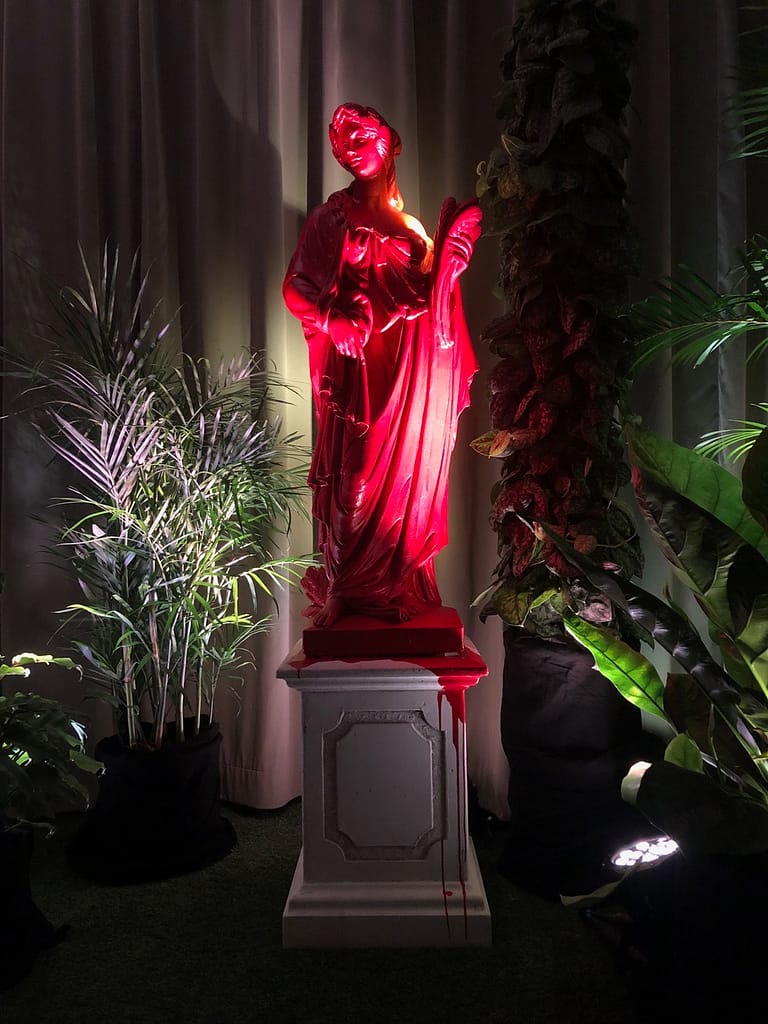 Umgeben von Palmen steht eine Steingussstatue übergossen mit glänzend roter Farbe, die über den Sockelrand tropft wie der Zuckerguss eines kandierten Liebesapfels: Ist das ein Protestakt gegen klassische Allegorien oder eine Vorschau auf das Dessert? Oder ist die blutrote Frauenstatue ein Sinnbild für die rachsüchtige Rote Königin, Alices Widersacherin im Roman?
