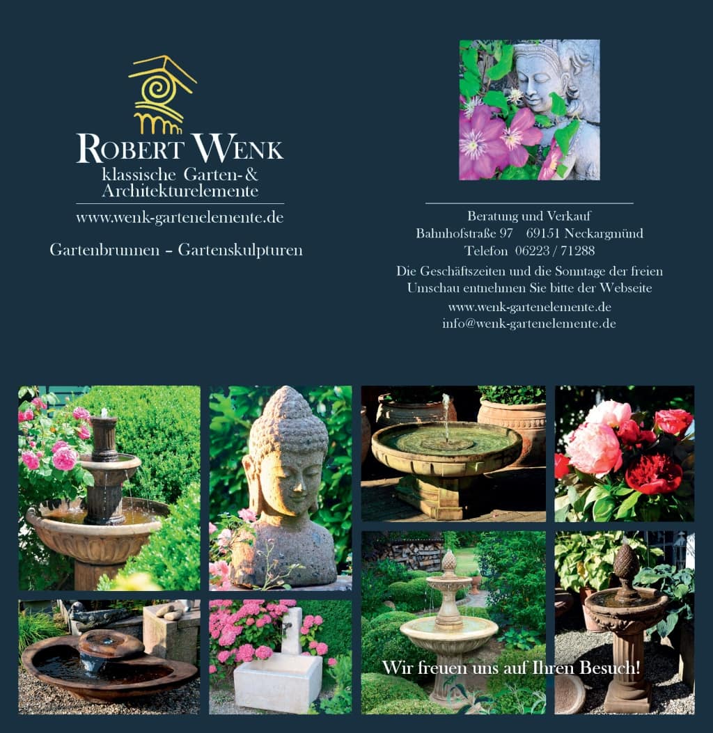 Seit 50 Jahren ist die Firma Wenk Garten- und Architekturelemente auf exklusive Steinobjekte für den Garten in bester Qualität spezialisiert. Unsere Firma wurde 1973 von Klaus-Dieter Wenk als Handelsbetrieb in Neckargemünd gegründet. Einen kleinen Teil der Stücke stellte man selbst in einer Manufaktur her. Im Jahre 1993 übernahm Sohn Robert Wenk das Geschäft und erweitert das Sortiment seither ständig mit klassischen und außergewöhnlichen Artikeln für die Gartengestaltung.