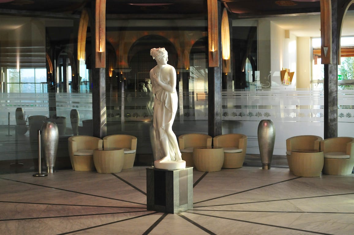 Eben den Fluten entstiegen verharrt sie in der Bewegung und blickt sich scheu um, das Badetuch ist ihr von den schönen Schultern gerutscht: Die lebensgroße Venus-Statue aus Steinguss steht im Mittelpunkt des zentralen Sauna-Umgangs in der Badewelt Sinsheim, von dem aus die Besucher die verschiedenen Saunabereiche erreichen.